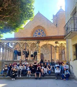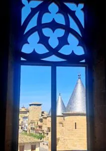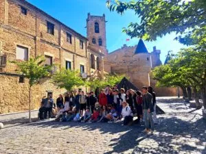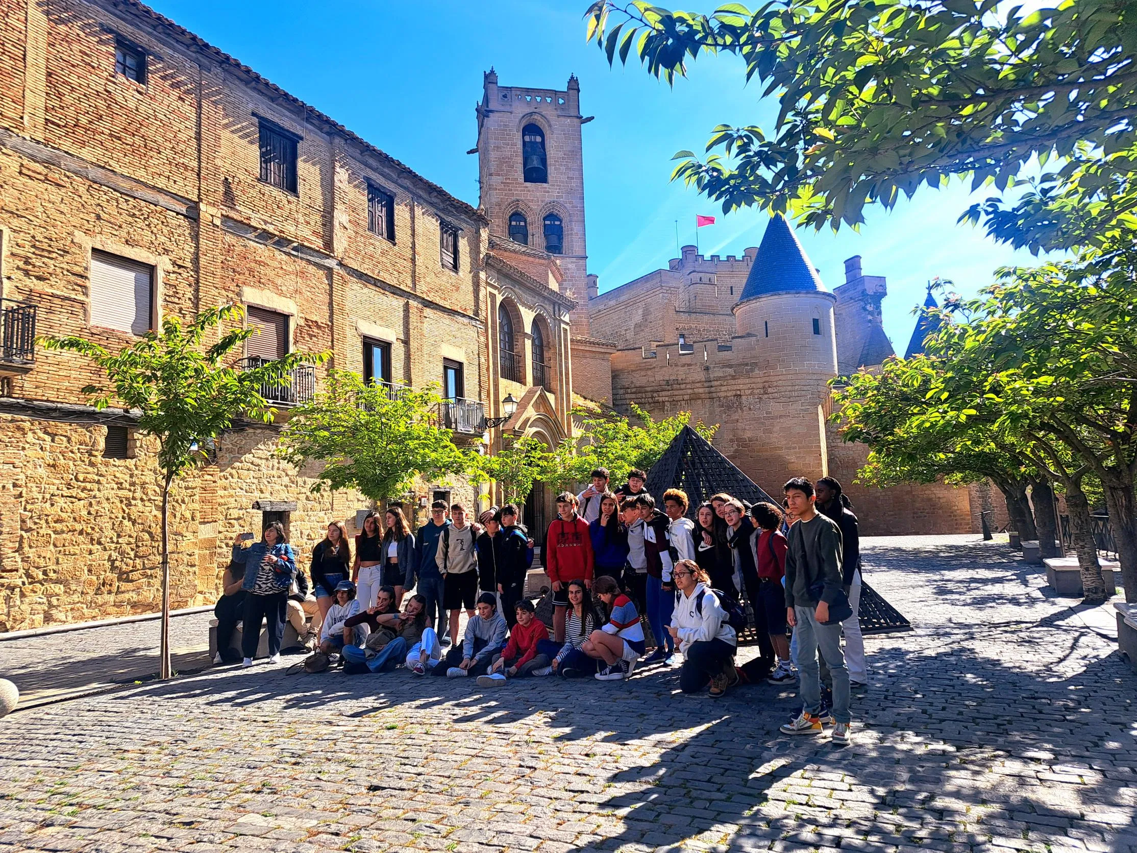 El pasado miércoles día 21 de mayo, el alumnado de 2º ESO pudo disfrutar de una excursión organizada por el Departamento de Geografía e Historia a la localidad navarra de Olite. Durante toda la mañana, esta singular población les trasladó a la Edad Media mientras recorrían las calles estrechas del centro histórico entre antiguas iglesias e imponentes murallas. Pero sin duda, la mayor atracción fue visitar el Palacio Real, un castillo que parece de cuento de hadas, con sus salones, jardines y esbeltas torres a las que no dejaron de subir y admirar.