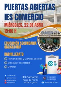 El miércoles, 22 de abril, a las 7 de la tarde, tendrá lugar la Jornada de puertas abiertas para ESO y Bachillerato en nuestro centro. Si quieres conocer nuestras instalaciones y programas educativos, ven a visitarnos.